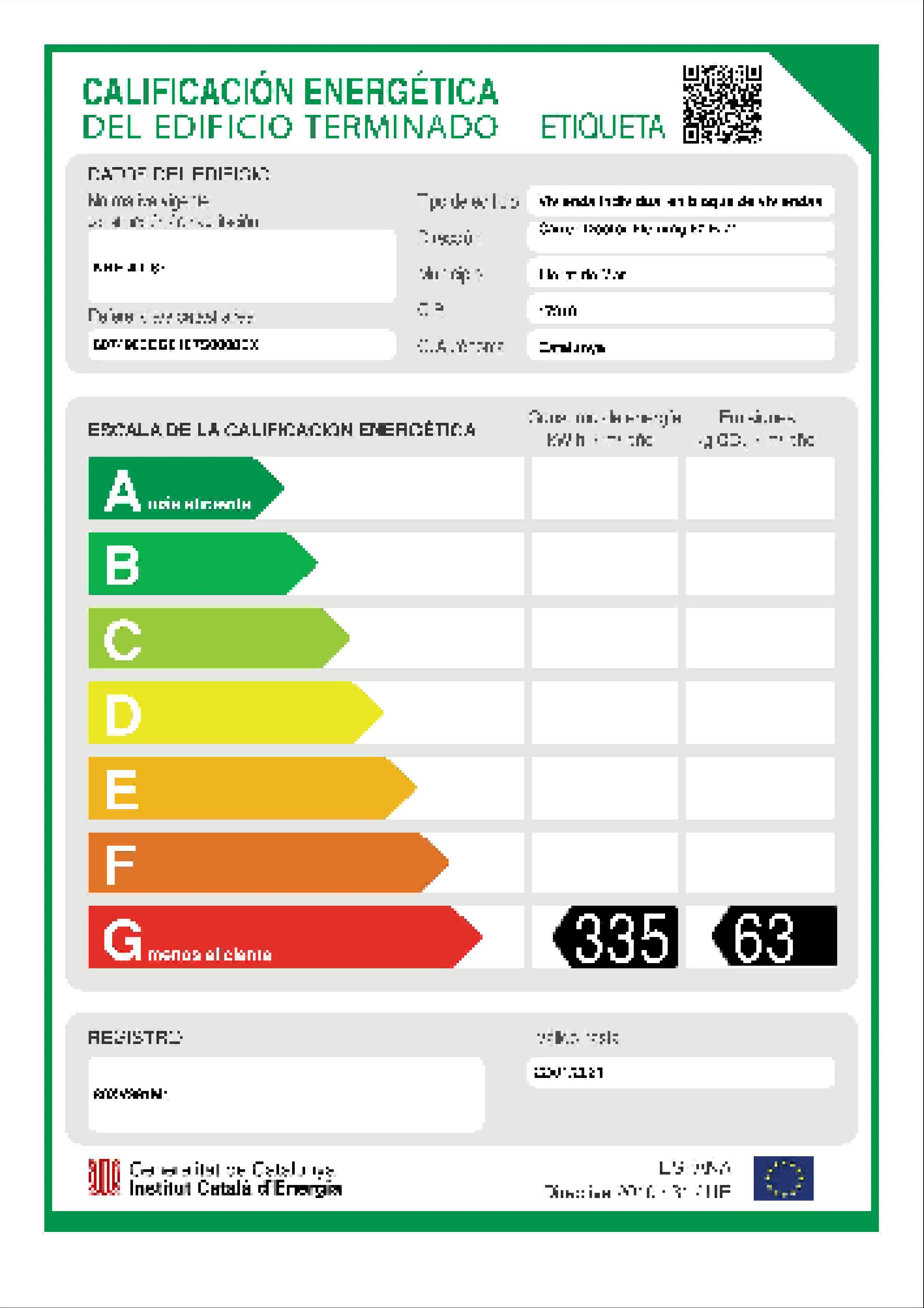 certificación energética , calificación de consumo: g , valor de consumo (kwh/m2 año): 335,31 , calificación de emisiones: g , valor de emisiones (kgrco2/m2 año): 63,63 , fecha de emisión: 22/01/2026 , fecha de caducidad: 22/01/2031