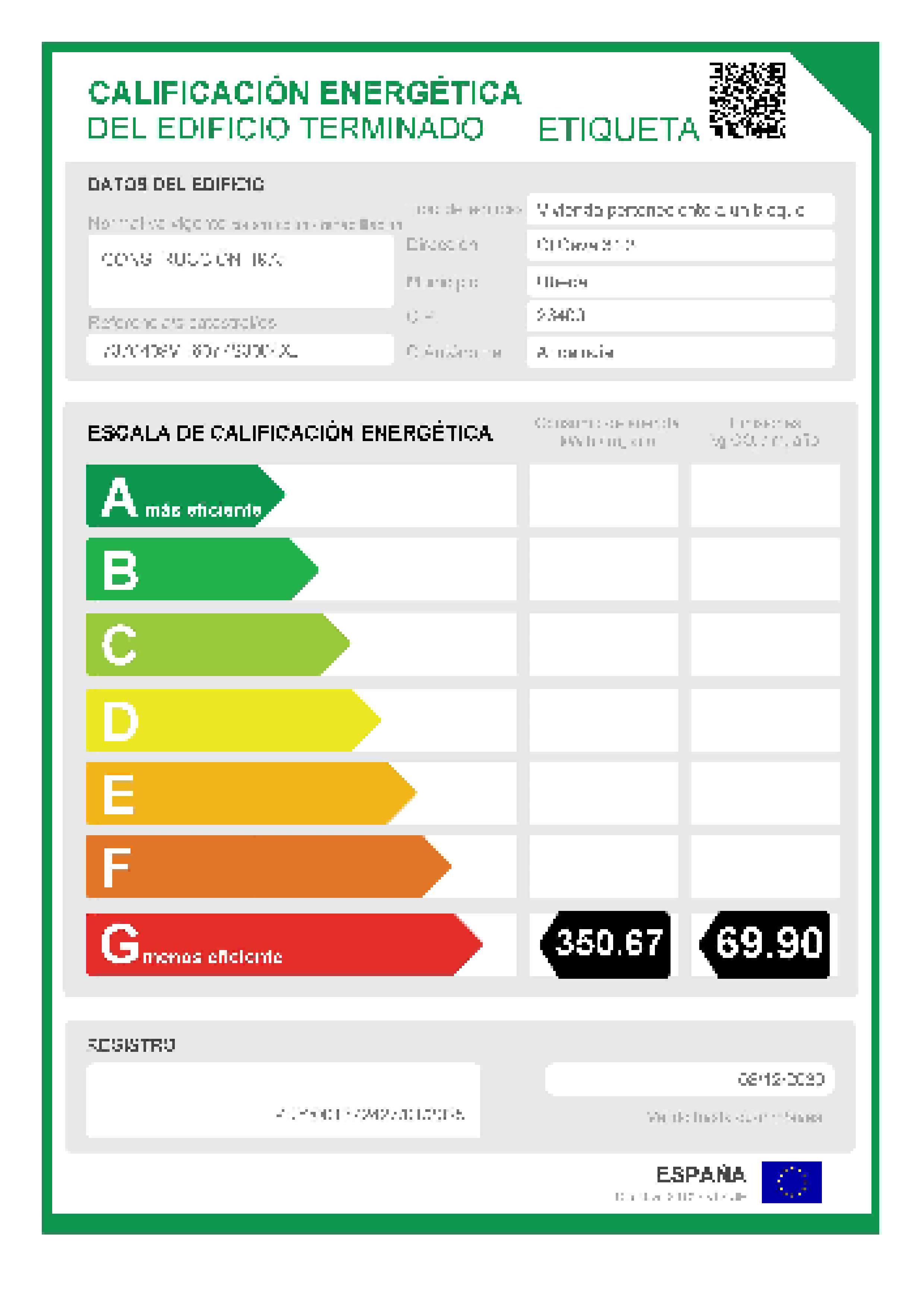 certificación energética , calificación de consumo: g , valor de consumo (kwh/m2 año): 350,70 , calificación de emisiones: g , valor de emisiones (kgrco2/m2 año): 69,90 , fecha de emisión: 09/12/2025 , fecha de caducidad: 08/12/2030